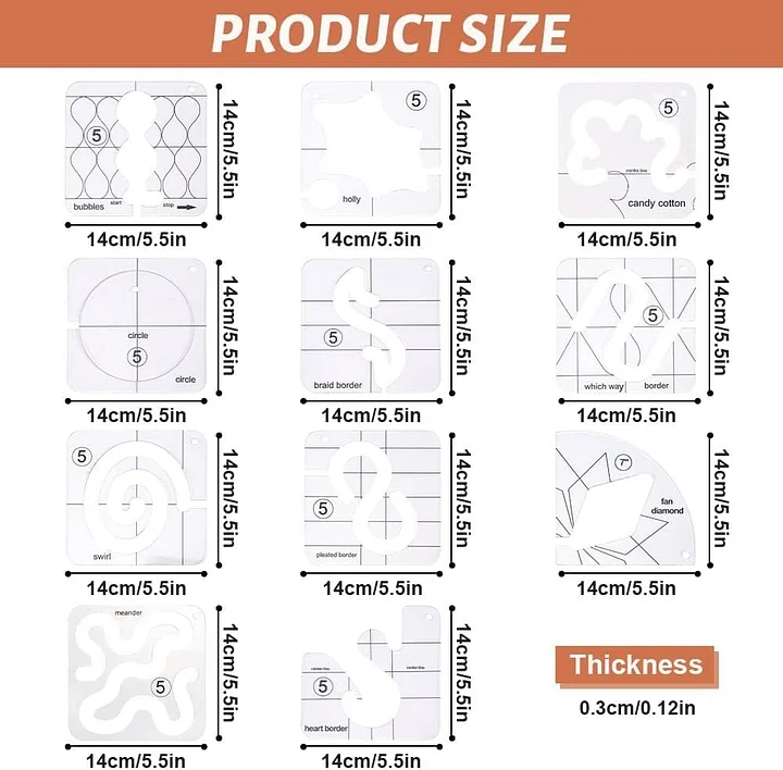Our Free Motion Quilting Templates include a variety of shapes that helps you produce a beautiful quit among other projects with your imagination and creativity. Precisely made of high-quality acrylic chosen for its strength, transparency, and sustainability.